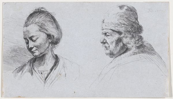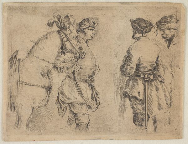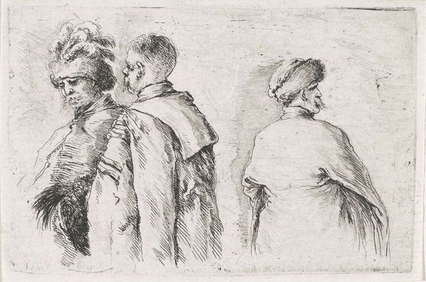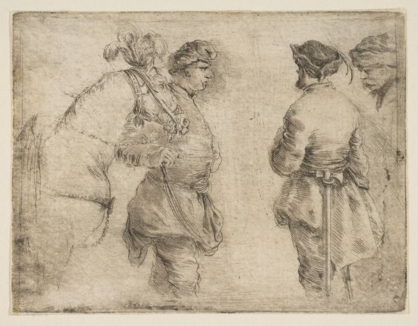Curator: This is Stefano della Bella’s etching, “Four Turks, Half Length,” created sometime between 1657 and 1667. Editor: My first impression is how textured it is! The density of those etched lines creates real visual weight, especially in their clothing. You can almost feel the coarse weave of the fabric. Curator: Precisely. Della Bella was deeply influenced by the Baroque fascination with exotic cultures, particularly Ottoman society. Prints like these circulated widely, shaping European perceptions. They offer us glimpses into a society perceived as radically different and powerful. Editor: It’s all about the process here. You can almost feel Della Bella's hand as he meticulously works the etching needle across the plate. This wasn't just a picture; it was skilled labor, reproduced for a burgeoning market interested in these "exotic" representations. Were these works commissioned specifically, or...? Curator: Some were commissioned, often by wealthy patrons, but the print medium also allowed for broader dissemination. Consider the cultural capital embedded in the image: these are not mere portraits, but studies in power and difference, consumed by European elites. Editor: And the clothing...the turbans themselves! The emphasis is on craft and design—materials brought to life. It begs the question: how accurate are these depictions? What materials and processes were actually employed to construct the original clothing, and how do they differ from the print's rendering? Curator: That's the crux of it. The etching process filters reality, presenting a vision through a specific cultural lens. How the artist transforms the costumes from the sitters they represent, how the audience engages and spreads these views, really highlights the political nature of art in Early Modern Europe. Editor: Absolutely. Examining the socio-economic context unveils so much more about the materiality. Where were the raw materials sourced, who fabricated these garments, and how did those labor relations impact European artistic production? It creates layers of questions to consider. Curator: Della Bella’s "Four Turks, Half Length" offers a portal into cultural exchange. Editor: It reminds us to look closely at both the depicted materials and the materiality of its making to decipher complex interactions.