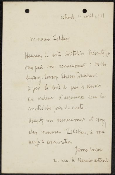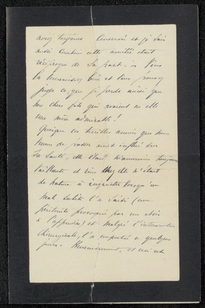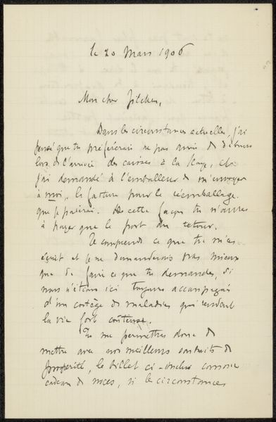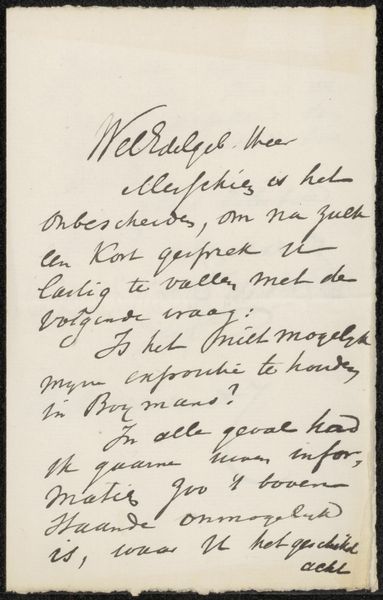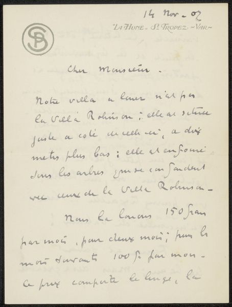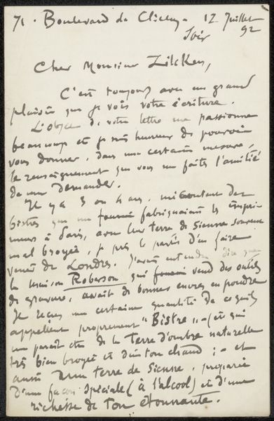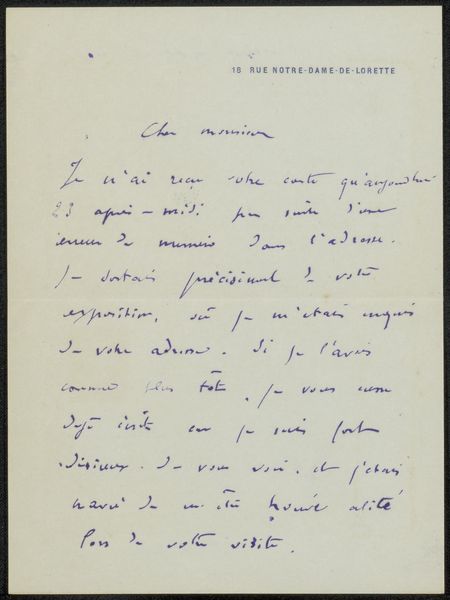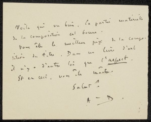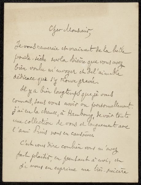 Curator: Well, here's an interesting one: a postcard or letter titled "Briefkaart aan Philip Zilcken" by E. Grès, likely from 1928 or 1929. It's ink on paper, with some watercolour too, judging from the light washes. It has such a gentle, almost faded quality...like a whisper from another time. Editor: It speaks of longing, or perhaps, wistful recollection. I’m struck by how class and privilege can be both visible and obscured within its material form. Here we have correspondence –likely between artists or intellectuals, given the refined hand and French script. It assumes a certain level of literacy and leisure rarely afforded to working classes. Curator: You’re right. I imagine the correspondence filled with talk of art, ideas, travels…perhaps even gossip! It’s intimate in a way that public art often isn’t. The aged paper only enhances that feeling, that it was meant for only one set of eyes. Editor: Exactly. The letter embodies a power dynamic through its existence. The materiality screams privilege; the access to education, refined language… these are coded forms of social distinction, intentionally or unintentionally perpetuated through acts such as letter writing. It’s more than just the simple act of sending mail. It's imbued with assumptions. Curator: But couldn’t you argue there’s also a generosity in sharing one’s thoughts, regardless of class? The artistry is clear, with the deliberate hand-lettering. It transcends mere information. Editor: I agree there is skill involved, a kind of craft. Yet the system that valorizes “craft” often overlooks or erases similar skillsets found in marginalized communities, coding them as "folk art" or mere “labor.” This artwork then becomes emblematic of whose stories we elevate, and how. Curator: I hadn’t quite considered it that way before. It really does make you rethink what we prioritize in our narratives. Editor: And maybe think about what it means to write a postcard now, when digital communication flattens so many interactions into the immediate, versus the layered temporal dimensions of slow, material exchange. Curator: Indeed. There’s something so poignant about those layers, visible right on the aged paper itself, now that you point it out. Thank you for sharing a completely different perspective!