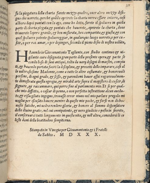 Curator: Let’s turn our attention to a page from Giovanni Antonio Tagliente’s *Essempio di recammi*, created around 1530. Editor: The stark black-and-white contrasts immediately grab me. The text feels dense, almost claustrophobic, but the glimpses of illustrations offer small reprieves. It's very focused on the techniques and labor necessary for production. Curator: Indeed. Tagliente’s work is incredibly important because it gives insight into the world of Renaissance needlework and its connection to feminine education and cultural values of the time. This page is essentially a pattern book, instructing women in the intricate techniques of embroidery. Notice the elaborate initial “R.” Editor: Absolutely! This wasn’t just about aesthetics; needlework was a craft—a skill—and books like this directly impacted what women could produce and contribute within their households and, by extension, to commerce. Can you imagine the time spent learning each stitch? The materiality is key: linen, silk, metal threads; all transformed through practiced labor. Curator: Precisely! And think about the social expectations embedded within this labor. It highlights the intersection of skill, gender, and class. Women, constrained by societal roles, found a means of creative expression and, potentially, economic contribution, using patterns like these. The very act of embroidering these patterns allowed for creative license and, perhaps, a subversive interpretation of prescribed roles. Editor: It really highlights the dual nature of these kinds of domestic crafts; they confine, but also empower. The labor, material and instruction encoded within a small, practical object open so many discussions on skill and technique! Curator: Exactly. Examining Tagliente’s book through the lens of cultural expectations and practical skills shows how the personal, creative labor becomes intrinsically linked with identity formation and gendered expectations within Renaissance society. Editor: It prompts us to consider what happens when we view domestic labor as culturally and economically important practices—practices with both creative skill and great amounts of effort required. Curator: A deeper look helps us understand not only the skills of women, but also the intricate web of power and creativity intertwined within seemingly simple acts of artistic craft.