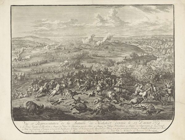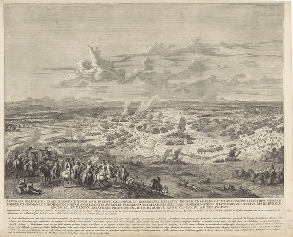 Curator: This is Sébastien Le Clerc the elder’s “Mons, Capital of Hainaut.” Though undated, it depicts the siege of Mons in 1691. What leaps out at you? Editor: It’s like a dance of smoke and fire—a brutal ballet. The plumes feel almost celebratory, yet the scene is undeniably violent. There is a strange beauty in destruction. Curator: Indeed. Le Clerc, born in 1637, captures not just the siege, but also the theater of war, with that procession of soldiers in the foreground. Editor: I see these sieges as powerful symbols of cultural and political shifts, the relentless tide of change crashing against the walls of tradition. Curator: A potent reminder that even the most fortified cities can crumble, not just physically, but as emblems of a certain era. Editor: Leaving us to ponder what new symbols will rise from the ashes.