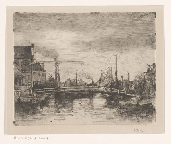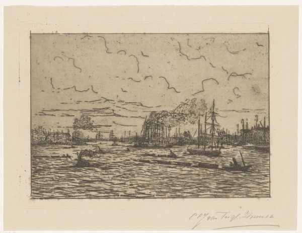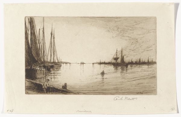 Curator: Here we have "Evening" by Stephen Parrish, an etching dating back to the late 19th century, a print that currently resides here at the Minneapolis Institute of Art. Editor: A captivating cityscape! There is something about the texture of the etching that lends itself so well to depicting this serene scene. It feels subdued, the muted tones almost blurring the horizon, evoking a certain nostalgia. Curator: Parrish's print captures the zeitgeist of the late 19th-century artistic movements. The style suggests impressionism—how urban landscapes and the daily lives were represented in the context of rapid industrial change, documenting societal moods through the artistic lens. Editor: It’s intriguing how the composition guides your eye, with those dominant masts in the foreground pulling you toward the reflected light on the water and the cluster of buildings further back. Notice the atmospheric quality too—those wispy, ethereal strokes suggesting twilight skies and light reflecting on the water. The horizontal lines accentuate the flatness, drawing the viewer's eye into its stillness. Curator: The choice of a port as the location, and its capturing as a print for mass consumption underscores a particular moment in societal memory. Maritime commerce shaped urban centers, fostering cultural exchange, the printing process democratized art, bringing views like this into more homes and thereby reinforcing the symbolic role of these locations. Editor: Yes, there is something quite grounding in Parrish's execution. Even with its subtle color scheme, the image isn’t without a certain tactile quality. Curator: In conclusion, Parrish's "Evening," serves as a bridge, intertwining shifts in society with an intimate visual exploration of time and place. Editor: Indeed. Looking closely at this etching deepens our appreciation of tonal subtleties—leading to its quiet contemplation on the water and that slice of fading light.