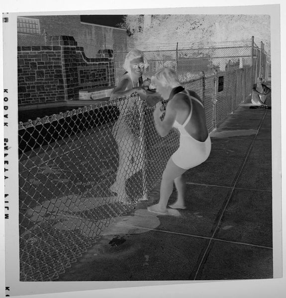 Editor: This is an untitled photograph by Jack Gould of a man and boy playing baseball. It's compact, almost snapshot-like. With the inverted tones, it feels like a memory trying to surface. What stands out to you? Curator: The game itself acts as a ritual, doesn't it? Baseball is deeply entwined with American identity, symbolizing community, leisure, and a certain nostalgic vision of family life. The inverted image makes us question this familiar narrative. Editor: So, you're saying the inversion gives us distance? Curator: Precisely. It defamiliarizes a common scene, prompting us to consider what is usually unseen or taken for granted in these representations of domesticity and masculinity. What does it mean to idealize these moments? Editor: I see what you mean. It's like the photograph is asking us to look at those ideals more critically. Thanks!