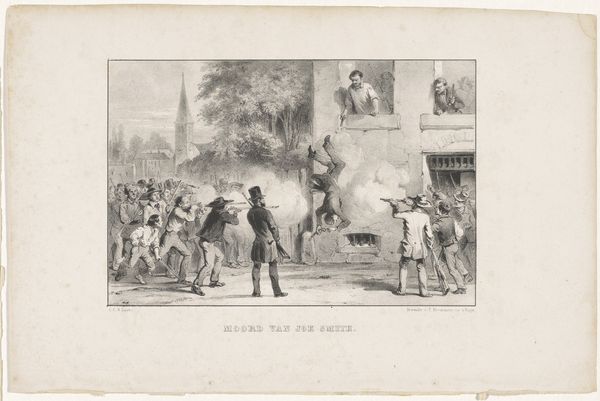 Curator: Looking at this image, I immediately notice the figures, all surging forward as though pulled by an invisible force. Editor: Indeed. This is "September 8th at Heart's Content, the day of the successful termination of the work of laying, recovering, completing and testing the Atlantic Telegraph Cables of 1865 and 1866," crafted by Robert Charles Dudley in 1866. The medium is gouache. Dudley’s attention to detail and realistic style transports us directly to that pivotal moment. It currently resides here at The Met. Curator: Pivotal is an understatement! The image vibrates with activity and shared accomplishment. What a study in light and color too—see how the hues seem almost desaturated in a nod to industrial innovation? Editor: Consider, though, what constitutes that accomplishment. The successful laying of the telegraph cable depended upon massive investments of capital, resources, and manpower. How might these celebrations be interpreted as moments of legitimization of global capitalist infrastructure and material expansion? Curator: That’s interesting—to view it as more of a social document. Structurally, I’m captivated by the perspective; our eye is swept along with the figures towards the background, creating an illusion of depth that complements the feeling of excitement. The way the building nestles just off-center creates visual harmony amid the crowd’s chaos. Editor: Precisely. Observe that most of these labourers who would be part of laying the cables are faceless. While this painting certainly demonstrates an air of communal victory and hopefulness about further technological advances, where is the discussion on labour rights here? Where is a visual testament to the grueling toil involved? Curator: Perhaps Dudley wanted to highlight only a triumphant resolution after struggle, which resonates universally even now. I notice, in hindsight, it might not sit comfortably. Editor: Exactly! Analyzing artworks in conversation can really deepen appreciation on all sides. Curator: Agreed! Considering the materials, context, and compositional details certainly allows me to see artworks from completely new and unexpected angles.