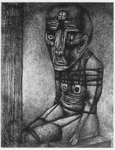 Editor: This intriguing work is an untitled drawing by Zdzislaw Beksinski. The materials seem to be primarily graphite or pencil on paper, creating a very textural image. It feels raw and unsettling. What's your interpretation of the material handling in this piece? Curator: The starkness of the graphite underscores the harshness of the subject matter. Notice how the layering of the graphite creates both the figure and its implied setting. Beksinski seems interested in pushing the limitations of this "humble" medium to capture states of suffering. The cross-hatching, a direct action of the hand, hints at a sense of anxiety and intense, laboured creation. What do you make of this raw quality? Editor: It makes me wonder about the time and physical effort Beksinski invested in this piece. The marks suggest both control and a kind of frenzied energy. Is the lack of color significant? Curator: Absolutely. The absence of color forces us to focus on the line, the density, and the application of the graphite. The monochrome emphasizes the materiality, and the lack of ornamentation connects this with social-realist strategies in communist-era artmaking that sought to represent a common human experience stripped of glamour. Does knowing this inform your viewing? Editor: Yes, it makes me consider the artwork less as a purely personal expression and more as a statement reflecting societal or political conditions of labor and bare existence. The medium amplifies that sense. I hadn’t initially considered the historical and social context so directly. Curator: Precisely! Considering the material and the artist's hand as a kind of labour helps reveal deeper meaning. Seeing art in the social context provides us a new angle for discussion.