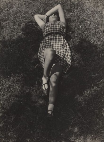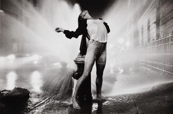 Curator: The black and white gelatin silver print before us is entitled "Cabbagetown." It was captured in 1998 by Michael Ackerman. What’s your immediate take on this piece? Editor: A raw, slightly unsettling glimpse into childhood. The limited palette focuses the eye so well, but what stands out to me is the perspective; the young girl walks away from the viewer. There is also something strangely oppressive about the steepness and buildings. Curator: I notice how the upward tilt almost pulls us back to something primal. A girl wearing a bright floral dress walks uphill, away from the viewer, alone. I'm not familiar with the history of this area. Editor: It's named Cabbagetown because, well, Irish immigrants reportedly grew cabbages in their front yards there. Now, seeing it through Ackerman's lens, it almost takes on a symbolic meaning: survival, roots, simplicity. Curator: Exactly, her smallness emphasized by those rough walls creates an interplay between vulnerability and the fortitude required to navigate harsh environments. It really underscores that common symbolic language. The long thin material flowing from the back is also meaningful; like a string or perhaps the end of a kite blowing wildly in the wind. Editor: The high contrast enhances the feeling; like an old memory flickering between stark clarity and deep shadows. It speaks volumes about resilience and community in an area shaped by socio-economic realities. It feels so grounded in the social environment; its buildings and pathways a historical palimpsest. I think this photo transcends the boundaries of portraiture. Curator: Right. Instead of focusing on her individual traits, the framing transforms her into a symbol of the universal challenges faced by children in these environments. A representative figure if you will. What Ackerman does exceptionally is weave visual poetry around themes of memory, abandonment and marginalization. Editor: A stark reminder of how geography and history shape individual narratives. Thanks for sharing. Curator: Indeed. Every mark in "Cabbagetown" seems a signifier in a larger drama.