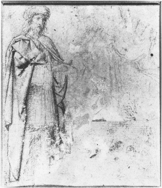 This is Angiolo Falconetto's "An Apostle," made in the 16th century. Falconetto was working in a world deeply shaped by the renaissance. The figure embodies the intersection of religious devotion and humanistic inquiry which characterized the era. With its detailed lines, the print captures the emotional weight carried by the apostle. The apostle’s attire and posture reflect a blending of classical and Christian aesthetics. Note the bare feet, a signifier of humility and spiritual purity. The apostle has a compelling intensity which speaks to the personal and emotional dimensions of faith. Falconetto was interested in the psychological depth of his subjects, rendering the apostle as someone grappling with profound truths and responsibilities. The piece serves as a reflection on the burdens and complexities of spiritual leadership.