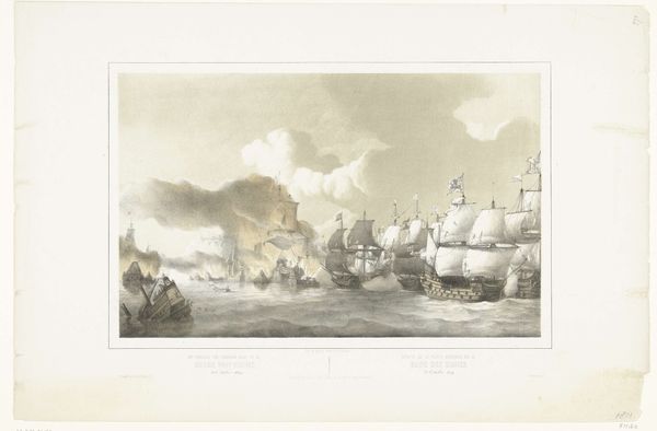 Petrus Johannes Schotel created this artwork, "Zeeslag bij Bergen, 1665," using etching. The print plunges us into the heat of a naval battle, dominated by the imposing structure of warships. The composition, which is in black and white, uses line and form to generate a sense of dramatic tension. The textures vary from the smooth water to the rugged mountains in the background. This contrast heightens the emotional impact of the scene. The ships, rendered with meticulous detail, might be interpreted through a semiotic lens. The orderly arrangement and repetition of forms within the ships communicate a visual language of power and control. In contrast, the billowing smoke disrupts this order, introducing an element of chaos, hinting at the destabilization of established hierarchies. The formal qualities of the work function as part of a larger cultural and philosophical discourse about maritime power, conflict, and the representation of historical events.
