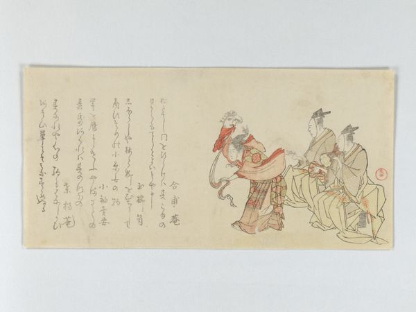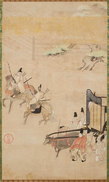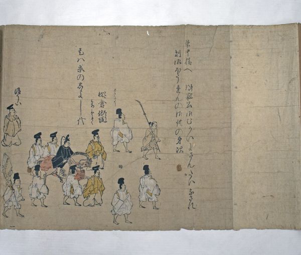 Editor: This is “Pilgrims Travelling to Ise,” an 18th-century ink and paper drawing by Chōdō, now residing at the Met. There's a sense of communal labor and journey. It seems like the artist is highlighting a very specific moment and method of travel. What do you see when you look at this work? Curator: As a materialist, I'm immediately drawn to the socio-economic context of this pilgrimage. Look at the diverse roles involved in the journey—the palanquin bearers, the animal handlers, and the pilgrims themselves. The drawing acts as a record of the physical effort and social stratification inherent in pilgrimage. How does the artist depict the burden of labor? Editor: It’s subtle, isn't it? They aren't overtly emphasizing the physical strain. Is this possibly related to idealizing folk life at the time? Curator: Precisely! But even in this apparent idealization, consider the materials themselves. The ink, the paper - these were commodities, made accessible to a rising merchant class. What does the use of miniature, folk-art inspired aesthetic for narrative-art drawing say about the art market during that period? Is it democratizing art, or aestheticizing labor? Editor: So, the choice of materials and style, far from being neutral, reflects larger power dynamics? The artist chose specific materials knowing the impact this choice might carry? Curator: Absolutely! The materiality of this drawing and the means of its production and circulation place it firmly within a specific historical and social fabric. By emphasizing the laborers within the image as well as labor *required* to produce it, we can deconstruct its apparent simplicity and reveal underlying social commentary. Editor: I never considered the economics behind the artwork itself before. This completely changed how I see "Pilgrims Travelling to Ise.” Thanks for that! Curator: Likewise! It is fascinating how an image opens itself to you once you approach it with this material consciousness.