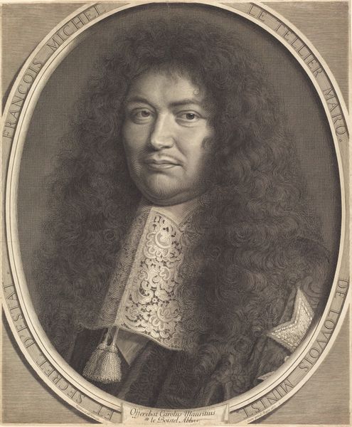 This is Robert Nanteuil’s portrait of Simon Arnauld, Le Marquis de Pomponne, an engraving rendered with meticulous detail. The composition is dominated by the Marquis's face, framed by a voluminous wig that cascades around him, creating a striking contrast between the soft, almost ethereal quality of the hair and the sharp, precise lines defining his facial features. Nanteuil employs line and texture to convey not just likeness, but also status and character. The intricate patterns of the Marquis’s clothing, along with the delicate lace collar, speak to his aristocratic standing, embedding the man within a visual language of power and refinement. The inscription encircling the portrait operates as a semiotic border, reinforcing the subject’s identity and societal role. The artist captures more than a mere image; he constructs a representation deeply embedded within the social and political structures of his time.