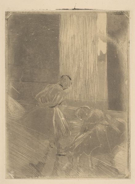 Editor: Here we have "Man die aan het wannen is," or "Man Winnowing," an etching by Willem Witsen, from around 1888. It feels quite somber and grainy. What jumps out at you about it? Curator: The immediate resonance is in the universal theme of labor. The repetitive act of winnowing – separating grain from chaff – has been a symbol of agricultural life for centuries, imbued with notions of both sustenance and hardship. The low-key palette is significant, as it mirrors the drudgery inherent in such work, something honest and raw. Don't you think so? Editor: Absolutely, that makes sense. The figure is so engrossed in the winnowing, there is a sense of isolation. I almost feel like he blends into the surrounding textures. Curator: Note how Witsen uses etching to capture the texture of the rural landscape – the rough wall, the damp earth. What feelings are stirred in you by the tree behind the wall? Is it barrenness or potential? Editor: Hmmm, it adds a certain vulnerability... reminding me of the fragility of life in general, or maybe the precarity of existence for the working class at the time. Curator: Precisely. It makes you ponder the role of work itself in our culture and individual lives, doesn't it? It is both necessary and, here, appears deeply personal. How does the work become a defining part of the person's identity? That idea continues to echo through art today. Editor: That's true; there's something almost timeless about it, even though it's very much of its time. It has made me consider that images have embedded cultural meaning beyond initial representation. Curator: Exactly! We're not just looking at an image, we're participating in a conversation that spans centuries, as artists use visual symbols to address these ideas of humanity across generations.