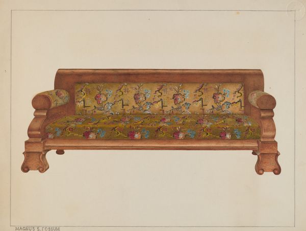 This watercolor drawing depicts a Duncan Phyfe Settee. The settee’s design includes elements derived from ancient Greek and Roman forms, such as the curved legs terminating in claw feet. These feet are evocative of animal power and protection. Consider the lion's paw, a symbol used since antiquity, from the thrones of ancient rulers to Renaissance art. It represents strength, courage, and dominion. This motif, which resurfaces here in a domestic setting, reveals how symbols of power infiltrate everyday life. The claw foot, therefore, is not merely decorative but carries an emotional weight, linking the sitter to a lineage of authority and grandeur. This enduring symbol transcends mere design; it speaks to the collective memory of power and the subconscious desire for status and security.