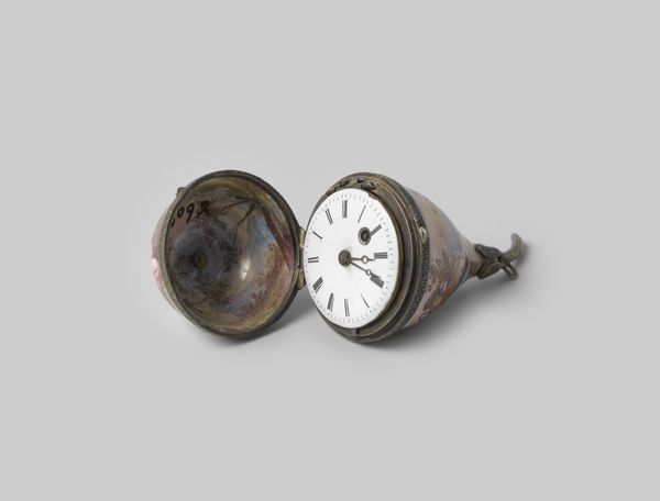This 'Horloge', or clock, was made by Hirsco. I can't tell you when, exactly, but it definitely has the patina of something aged. The clock face is nested within a larger disc, and it makes me think about time within time. The whole thing is subtly textured, with a tactile quality, and those little ridges on the winding knob—beautiful! It’s tempting to reach out and touch, isn't it? I wonder how often it was wound, how many hands have turned that little knob. The whole surface has an almost metallic finish that suggests something both functional and beautiful. Look at how the hands on the clock don't quite meet in the middle, as if time itself is not quite as cohesive as we think it is. The blued hands are a surprise, a little spark of colour within this grey and silver object. It reminds me of the work of Tara Donovan, who uses everyday objects to create these large, shimmering installations. Like Donovan, Hirsco transforms the mundane into something mesmerizing, inviting us to think about time in a new way.