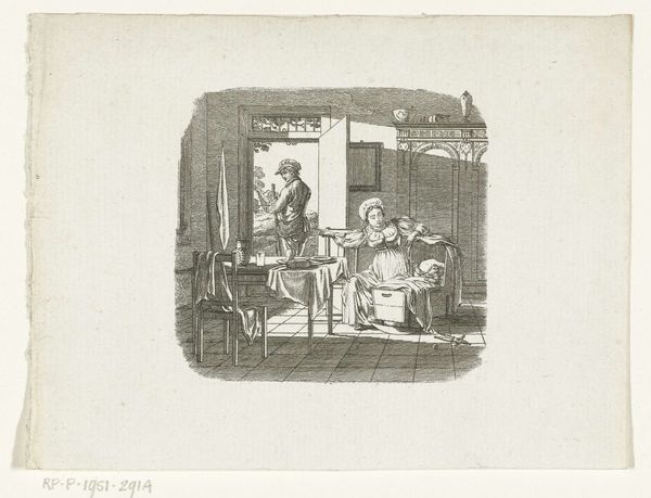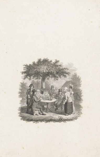 Editor: We’re looking at "Titelpagina voor: A. Loosjes, 'De man in de vier tijdperken zijns levens'" by Reinier Vinkeles, from 1809. It’s an etching, currently held at the Rijksmuseum. The figures seem carefully placed and almost posed; it reminds me of a staged tableau. What jumps out at you when you look at it? Curator: Oh, that's a fantastic question. Immediately, my imagination does a swan dive into the theatre of the self that the Romantics were so fond of exploring! We've got these distinct groupings – childhood, adulthood, scholarly life, maybe even old age reflected in the background. Each little pocket almost a scene in a play… a play about the journey of life, perhaps? Notice how lightly Vinkeles sketches. It's not just capturing what is; it's whispering about possibilities, about moments flitting past. It’s more idea than portrait. Editor: That idea of the journey, staged – it's interesting. Does that relate to the "four time periods" in the title? Curator: Exactly! The title locks the image’s narrative into a specific sequence, inviting viewers to engage with each period not as a static point, but as a phase within the cyclical nature of human life. Consider, too, the context of 1809: Enlightenment rationality wrestling with emergent Romantic emotion. The scholar bends over his globe, suggesting both knowledge but a kind of world weariness? Then there’s that mischievous boy, carefree – childhood personified, almost too brightly. It's like a balancing act isn't it, a dialogue. Editor: A balancing act, I like that. I hadn't really noticed all those small but significant aspects. Curator: Sometimes, dear student, the quietest lines speak the loudest, like a shy confession. Next time, observe where your eyes go *first*. That initial spark holds secrets, if you listen to it carefully. It is the beginning of the conversation that all good artworks long to have with us, like the first whispers of new friends we are bound to adore!