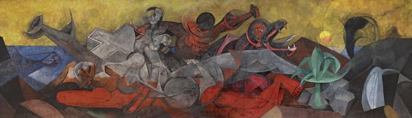 Editor: Max Beckmann’s “Night,” painted in 1918 with oil on canvas, is… intense, wouldn't you say? The claustrophobic composition and distorted figures really throw you off balance. I’m curious, what do you see as the heart of this chaotic scene? Curator: Chaotic is a brilliant word for it! To me, it’s like diving into a nightmare, a visceral reaction to the trauma of World War I that Beckmann experienced firsthand. Look at how he uses jarring angles and a limited palette—mainly these unsettling ochres and browns—to amplify that sense of dread. Does the arrangement of figures tell you anything about the emotional landscape of the moment? Editor: It definitely feels like a breaking point. The figures seem trapped, both physically and psychologically. Are those bound figures in the center meant to represent the helplessness of the individual in the face of war? Curator: Precisely! Beckmann doesn’t offer us easy answers or heroic narratives. It’s not just about physical captivity; it's about the imprisonment of the soul. He forces us to confront the darkest aspects of human nature. Tell me, how does that brutal honesty resonate with you? Editor: It's a little unsettling, if I’m honest. It's hard to look at but feels really… raw. It feels like he wanted the viewer to truly experience the horror without flinching. Curator: Exactly! Beckmann isn’t afraid to be difficult. This piece, with its unflinching portrayal of violence and despair, becomes a powerful statement against the dehumanizing forces of war. It's less about recording an event and more about excavating its emotional and spiritual impact. Isn't it fascinating how much emotional weight paint can carry? Editor: Definitely food for thought. I had no idea just how much personal history could be embedded within a scene like this. Curator: Art always shows something when you look closely, right? Always a little bit about the maker too!