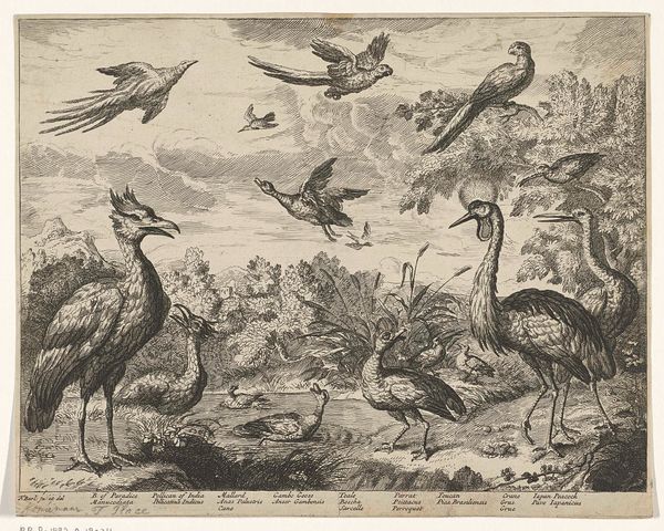 Jan Griffier created this print, "Verschillende vogels en een aap," using etching, a process that democratized image production in the 17th and 18th centuries. Here, Griffier presents us with a landscape populated by an array of birds and a monkey, seemingly observed through the lens of scientific curiosity, yet steeped in the period's colonial gaze. The attention to detail in rendering each species reflects a burgeoning interest in natural history, fueled by exploration and the desire to classify the natural world. But, for whom was this nature being classified? The presence of exotic animals invites us to consider the cultural and economic exchanges that shaped the era. While offering a glimpse into the wonders of the natural world, this image also reflects the power dynamics inherent in exploration, trade, and the human desire to dominate nature. It invites us to reflect on the complex relationship between observation, knowledge, and control.