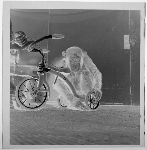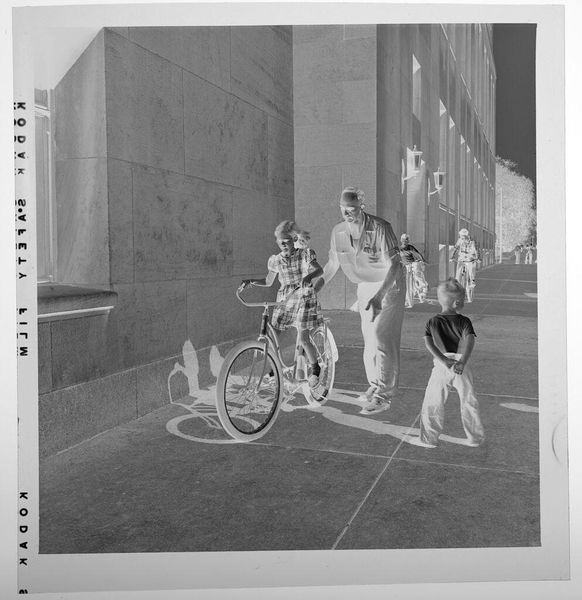 Editor: This photograph by Jack Gould, simply called "Untitled (boy in hat looking at front wheel of bike)", has such a classic feel. The young boy focused on his bicycle wheel seems like such a familiar scene. What strikes you about it? Curator: Well, the seemingly mundane subject matter is precisely what draws me in. Consider the social context – the bicycle as a symbol of freedom and mobility, particularly for young people. Editor: It makes you wonder about their lives. Curator: Exactly. And how the photograph, by capturing this everyday scene, elevates it to something worthy of our attention. It prompts us to consider the politics of imagery and the power of the photographic medium itself. Editor: I never thought about it that way. Thanks! Curator: My pleasure! It’s all about understanding the cultural narratives embedded within.