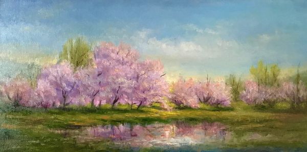 Curator: Here we have Rose Freymuth-Frazier's 2019 painting, "Wildflowers and Almond Trees". Rose often works en plein air, capturing fleeting moments directly from life. Editor: Well, the initial vibe is pure tranquility, but there's a subtle energy simmering beneath the surface. It’s a pastel dreamscape tinged with a vibrant pulse, almost as if the wind itself left a trace on the canvas. Curator: It's interesting you say that, I feel Rose truly has bottled a daydream with those layers of oil-paint. The light plays beautifully on the almond blossoms, doesn’t it? Note the impasto strokes – they give such dimension to the scene, allowing the texture to emulate those petals. Editor: Indeed. Those impasto areas articulate depth but also contribute a tactile language that heightens sensory awareness. The composition isn't merely representational; it's almost performative, inviting the viewer to witness the dance between material and subject. There's even a delightful tension arising between the representational subject matter and the painting's more abstract, impressionistic rendering. Curator: It definitely walks that edge, doesn't it? Those wildflower patches blur the line between the real and the recalled; it's as though nature's essence is distilled. I would like to add this use of color is also a noteworthy element. It’s amazing what she’s doing in trying to emulate a true impressionist style. Editor: Exactly, those touches resonate so brilliantly to create a sense of harmony, almost an emotional equilibrium. But what fascinates me most is how Freymuth-Frazier plays with foreground, middle-ground and background by layering paint like memory itself constructing an illusion with which to deceive the eye. Curator: Looking closer, one almost can feel the warmth of the sun on the skin and hear the gentle buzzing of bees… Perhaps Freymuth-Frazier hoped to elicit these emotions within her viewers. I’d say the attempt was more than successful. Editor: It seems like we both walked away today carrying something unique, didn't we? It serves as a nice reminder that within seemingly simple scenery we'll all discover unique perspectives, based on how we engage.