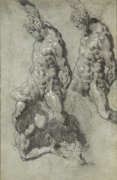 Editor: This drawing, "The Original Sin," depicts Adam and Eve and was created in 1611 by Bartholomeus Spranger using ink on paper. The figures are contorted and crowded, creating an unsettling tension. What symbolic elements are most striking to you? Curator: The serpent, of course, immediately captures our attention. But consider its positioning, almost crowning Eve. In Mannerist art, such exaggerated forms often signify not just sin, but the twisting of natural order and reason. How might the surrounding figures reflect this idea? Editor: The way Adam seems to recoil, almost violently, perhaps indicating an immediate, visceral reaction to the transgression. Is that reading too much into it? Curator: Not at all. The drawing captures that precise moment of realization and irrevocable change. The snake looks powerful here. How might our cultural understanding of snakes inform our experience of it today? Editor: In many cultures, snakes represent both chaos and transformation. The shedding of skin, I suppose, signifies rebirth. Could that potentially bring forth redemption following the original sin in this context? Curator: Precisely. This ambiguity is what makes Spranger's piece so compelling. The original sin is tragic. Yet the scene holds this duality; destruction intertwined with the potential for regeneration. Do you think the cultural context of 1611 when Spranger produced the work can reflect it, and why? Editor: Sure, in that era, there may be religious interpretations but also, a rising exploration of human nature and individualism. The artist captures this clash between moral rigidity and expanding knowledge of ourselves. I’ll think of rebirth from now on when viewing artworks. Curator: That's a great point and wonderful perspective, how imagery has the ability to be rooted in its past while pointing to future evolution.