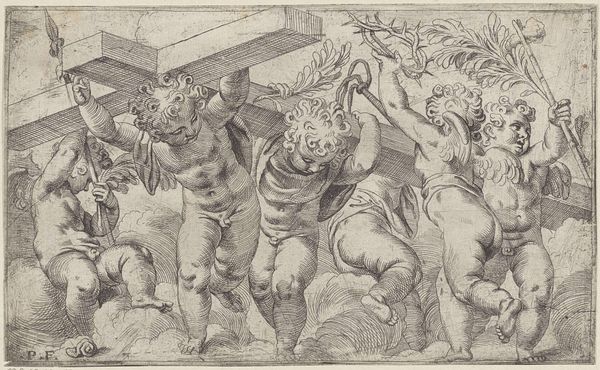 This print, "Putto, op een zeepaard gezeten," was made by Adam Fuchs in the late 16th century. It is made using the technique of engraving. Engraving involves cutting lines into a metal plate, inking the plate, and then pressing paper against it, transferring the ink. Each print requires the engraver to meticulously carve lines, demanding precision and skill, and the image is built up by many thin strokes that create tone. The engraver translates light and shadow into a language of line. Consider how this process influences the artwork’s appearance. The sharp, precise lines create a detailed image, the density of these lines creating tonal variation. The engraver’s skill is evident in the modulation of light and shadow, giving the figures depth and form. Understanding the labor-intensive process of engraving gives us a greater appreciation for the artistry involved. It challenges the traditional distinction between fine art and craft, highlighting the value of skilled handwork in creating visually stunning images.