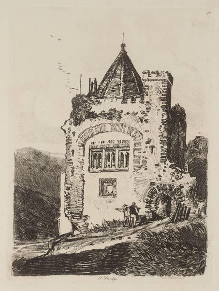 Curator: Looking at this etching, "Near Durham" by John Sell Cotman, created around 1838, what strikes you first? Editor: There’s a real sense of somber grandeur, a looming weight to the architecture depicted here. It feels incredibly steeped in history. Curator: It's fascinating how Cotman uses line and shadow, isn’t it? Cotman aimed to offer picturesque views that fed the 19th century’s fascination with the medieval past. His choices played a crucial role in how places like Durham were perceived and promoted as heritage sites. Editor: The building itself dominates the composition. The arched windows and the textured stone—they’re not just architectural details; they symbolize resilience, perhaps even spiritual endurance over time. The architectural elements are clearly meant to inspire feelings. Curator: Indeed. And the figures at the bottom seem almost secondary, perhaps included to give a sense of scale and reinforce the grandness of the architecture. Editor: The use of light definitely directs the viewer’s gaze. It draws your eye up to the architecture, almost encouraging you to imagine all the stories that building has witnessed. Curator: And yet, these architectural prints also played a part in constructing the idea of "Englishness." Cotman's meticulous focus on these landmarks helped to canonize particular historical narratives that persist even today. Editor: You're right, beyond the romantic aesthetic, it taps into this deeper sense of rootedness. An etching can't help but capture permanence on some level. Curator: Thinking about its original audience, what did viewing buildings through art like this accomplish for their social and historical consciousness? Editor: Well, it offered a tactile connection to the past, a way to claim some emotional ownership of their heritage. It’s not just seeing the architecture; it's about internalizing its emotional weight. It offers visual testimony. Curator: It truly speaks to the lasting power that symbols, like medieval architecture, hold within a culture. Thanks for sharing your insightful interpretation of this remarkable etching, it's enriched my understanding. Editor: The pleasure was all mine; the weight of this etching clearly speaks of England's rich and varied past.