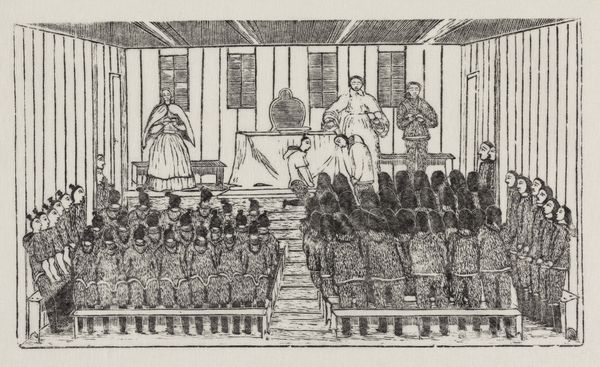 Aron of Kangeq made this woodcut depicting the baptism of Akamalik in Greenland. It's one of a series of images illustrating the story of Akamalik, a young Greenlander, and offers a glimpse into a specific cultural and historical moment. In the 19th century, European missionaries were active in Greenland, seeking to convert the Inuit population to Christianity. The image shows the interior of a church, with rows of Inuit people seated, many in traditional clothing. At the front, a baptism ceremony is taking place, presided over by missionaries. Aron was himself an Inuk, and his work provides a unique perspective on the impact of colonialism and religious conversion on Inuit society. His prints are invaluable historical documents, giving us insights into the complex social dynamics of the time. To fully understand this work, we need to examine missionary archives, travelogues, and anthropological studies. By placing the artwork within its historical and institutional context, we can begin to grasp its significance as a cultural record and a statement on the changing world of the Greenland Inuit.