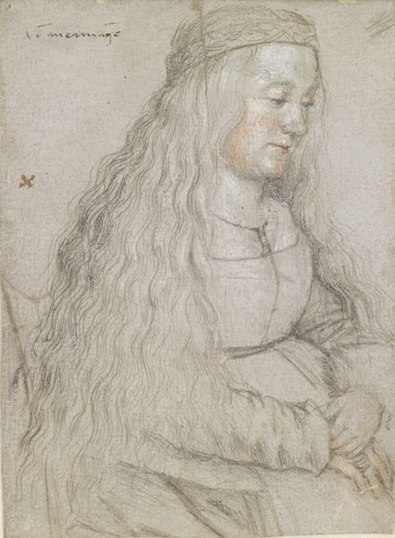 Editor: This delicate red chalk drawing, "Head of a Smiling Youth with Curly Hair Facing One Quarter Left," is by Giovanni Agostino da Lodi and is at the Harvard Art Museums. It seems so intimate, almost like capturing a fleeting moment. What stands out to you? Curator: Notice the recurring motif of the spiral in the hair. Spirals often symbolize growth, evolution, and even the soul's journey. Does the subject's closed eyes suggest contemplation, a world turned inward? Editor: I hadn't considered the spiral as a symbol. So, is the artist suggesting a deeper meaning beyond just a portrait? Curator: Precisely. Consider how the smile, combined with the closed eyes, might represent a serene acceptance or even a hint of inner knowledge. These visual cues, or what the artist chooses to exclude, are essential to our understanding. Editor: It's amazing how much can be conveyed through such subtle details. I'll definitely look at art differently now! Curator: Indeed. Art invites us to consider our own cultural memory and emotional responses.