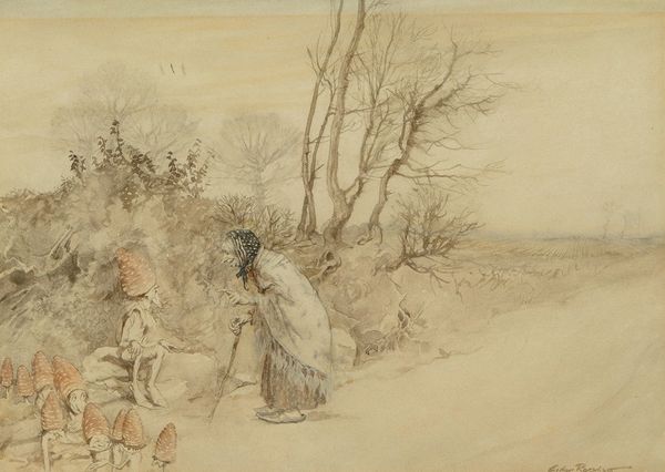 John Frederick Lewis captured this scene of rural life with watercolour and bodycolour. His identity as a member of the Victorian upper-middle class certainly shaped his vision of the English countryside, a vision often romanticized and detached from the realities of rural poverty. Here, we see a gamekeeper and a young boy engaged in ferreting rabbits, a hunting practice that relies on animals to flush out prey. The painting subtly reveals a rigid social hierarchy; the older man kneels in the dirt, while the younger one is outfitted in a long yellow coat. The artist seems to focus on the aesthetics of the hunt, rather than its economic implications for the rural population. This work invites us to consider the complex relationship between humans, animals, and the land. The image prompts questions about class, labor, and the romanticized depiction of rural England.