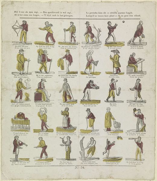 Curator: Let's take a look at this printed work by Glenisson & Van Genechten, titled "Myn knaepjes! deze prent verbeeldt den krijgeren stand, / En toont, 't beleid en moed der dappere soldaten. / Groeit ook zoo walig op voor vorst en vaderland, / Dan zal uw mannen hart geen spoor van lafheid laten." Created sometime between 1833 and 1900, it’s a really interesting example of early narrative art in print. Editor: Whoa. Okay, so first impression: It looks like a slightly chaotic flipbook frame, maybe? All these little soldiers, lines of them… Sort of charmingly militaristic? Like a toy soldier convention gone sideways. Curator: I think "charming" is a great way to put it. Prints like these, circulating in the 19th century, often served to instill patriotic values and offer accessible depictions of military life. Notice the repetition, how the soldiers in formation mirror earlier depictions of officers on horseback. It creates a sense of organized power but within a simple, digestible format. Editor: Definitely see the patriotism baked in – a little heavy-handed for my taste, I confess. All those rows of identical guys with rifles...it's more about uniformity than individuality, right? What strikes me is how they try to suggest motion by repeating nearly identical figures. A stagecoach morphing along with tiny little explosions of landscape behind them! It makes me grin, though. It’s utterly earnest. Curator: And, of course, the text underscores that very intent. It is very direct about encouraging young men to be brave for their country, playing directly into contemporary notions of civic duty and masculinity. These images really helped shape how ordinary people perceived their nation and their place within it. Editor: True, there’s context. But when I really zone in, I just see an artist meticulously scratching out a vision – maybe even someone feeling a touch rebellious doing it? It has that sketchbook quality – a little irreverent against something so stiffly political! What do you suppose the folks who first saw this really made of it, beyond all the State intention, of course? Curator: A complex question, because their understanding would have been filtered through different social norms and patriotic sentiments. But seeing art as a social tool like this opens up a wider discussion about how nations cultivate allegiance and image, from the ground up. Editor: Hmm…Food for thought indeed. Gives a whole new level of “depth” to kids playing with army men…Makes me rethink all kinds of things, not just the visual layers…