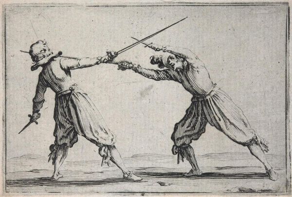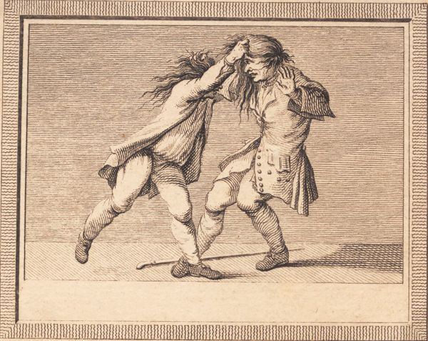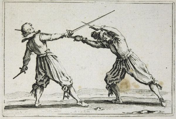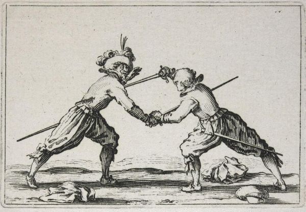 Editor: Here we have a work titled "Copy of Le Duel a l'Épée et au Poignard (The Duel with the Sword and Dagger), from 'Les Caprices,'" created sometime between 1620 and 1700 by an anonymous artist. It’s an etching or engraving, and the composition, stark as it is, really captures the intensity of the moment. What strikes you when you look at this print? Curator: What grabs me is how this image, ostensibly a genre scene depicting a duel, also operates within the context of power dynamics and social rituals of the Baroque era. Dueling, though often romanticized, was deeply intertwined with class, honor, and the assertion of masculine identity. Considering the piece's historical moment, how might this seemingly simple depiction of a duel be read as a commentary on social structures? Editor: That’s a fascinating angle. So, beyond just illustrating a duel, you're saying it could be interpreted as a critical look at the norms and expectations placed on men in that period? Curator: Precisely. Look at the attire, the specific weapons chosen—each element speaks volumes about status and the prescribed ways of resolving conflict. These men are masked and fighting on what appears to be a blank, theatrical stage, so, who might this ‘performance’ have been for, and who benefits from it? How does it reflect broader socio-political concerns, especially regarding gender roles and class distinctions? Editor: It's incredible to think about how much a single image can unpack! I initially saw just a fight, but now I recognize all these additional layers about the historical context. Curator: And the beauty of art history lies precisely there—in uncovering these layers and challenging preconceived notions about the artwork. The context shapes meaning, and that meaning helps us see the context more clearly, too. Editor: That's something I will keep in mind moving forward. Thanks for sharing your thoughts!