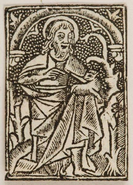 Editor: This is an anonymous woodcut of Saint John the Baptist. It’s so detailed! It’s also interesting how he is standing over this dragon-like creature, while holding a banner with a lamb. How do you interpret this work within the historical and social context? Curator: Well, remember that prints like these often circulated amongst the masses. Given the context of religious upheaval at the time, the image of Saint John might have been a potent symbol. Editor: Symbol of what? Resistance? Faith? Curator: Possibly both, perhaps even a call for reform. Consider the lamb on the banner – the Agnus Dei– a direct reference to Christ's sacrifice. But what does it mean to show St. John standing over a dragon? Editor: Maybe the triumph of faith over evil. I hadn’t considered the social implications. Curator: Exactly! Art serves as a powerful tool for understanding historical narratives. Editor: I'll never look at a woodcut the same way again!