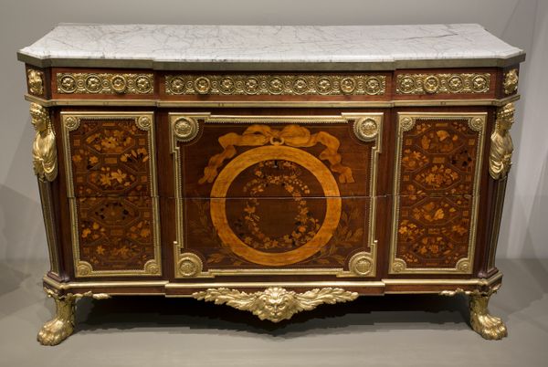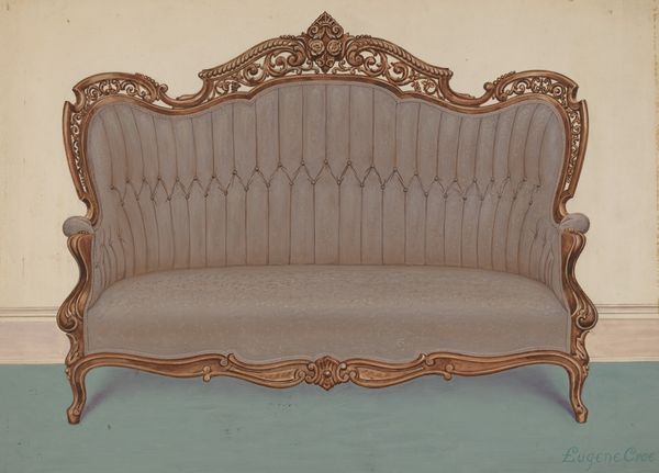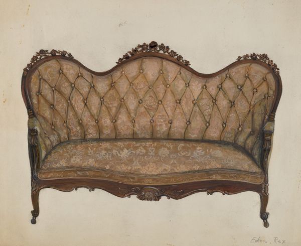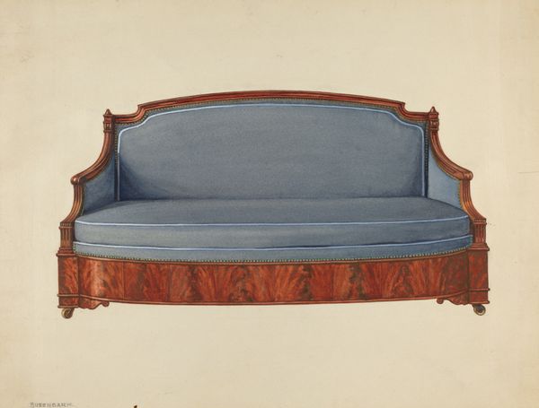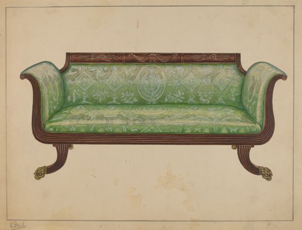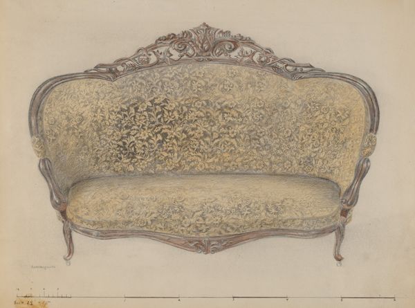 Curator: This is Edward A. Darby's "Mahogany Sofa," a watercolor from between 1935 and 1942. Editor: My first impression is one of careful detailing and a warm domesticity. The ornate shape and the patterned upholstery give it a luxurious but comfortable feel. Curator: Absolutely. Darby’s skill with watercolor captures the textures of both the wood and the fabric beautifully. Consider the way he renders the wood grain and highlights, juxtaposed with the soft, repetitive pattern of the fabric. The piece prompts questions about the status of furniture-making and domestic labor during the interwar period. Was this sofa aspirational? Who owned it? Editor: I'm drawn to the curvature, the lines moving across the frame and how the upholstery's floral patterns work with the sofa’s shape. The way the arm gently slopes down invites the viewer to imagine reclining there. Semiotically, it’s interesting: what is being communicated here through the signifiers of comfort and luxury? Curator: Beyond aesthetics, the sofa invites reflection on industrial production. Mahogany as a material carries historical weight—often linked to colonial trade and labor exploitation. Darby, even unintentionally, alludes to global economic structures simply by depicting this single piece of furniture. We should ask, where did the mahogany come from, who crafted this? Editor: You make a crucial point about origins and processes. It certainly shifts my perspective beyond its formal qualities. Thinking about its composition: the sofa dominates the pictorial space. The background is stark, drawing all the attention to the furniture, an isolation that highlights its form. The artist invites close inspection of craftsmanship, to value this ordinary object. Curator: Precisely, elevating a seemingly mundane object, like a sofa, asks the audience to think about how it functions within a wider socio-economic picture, connecting art with real lived experience and the realities of making things. Editor: It’s true, reflecting on its history does change the viewing experience for me, allowing me to really appreciate how much social information it presents alongside such graceful curvature and texture. Thank you for pointing that out.