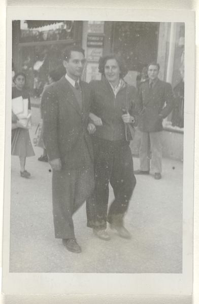 This photograph of Isabel Wachenheimer and Leo Blumensohn in Amsterdam was taken in May 1947 by an anonymous photographer. The chemical process of black and white photography renders a moment into a reproducible artifact, but let's consider the materiality of what’s depicted. Both figures are wearing wool coats. The cloth would have begun as fleece, sheared from sheep, spun into yarn, then woven into fabric. This required intensive human and animal labor, and the labor continues in the tailoring, button making, and pressing of these garments. Their clothes are not ‘high fashion,’ but serviceable, well-made, and meant to last. Consider the cultural context in which this photo was taken: two years after the end of World War II, the subjects’ very survival bears witness to extreme historical circumstances. The photograph reminds us that even everyday objects can carry tremendous social weight. It challenges us to look beyond the image itself and consider the lives, labor, and historical processes woven into its very fabric.