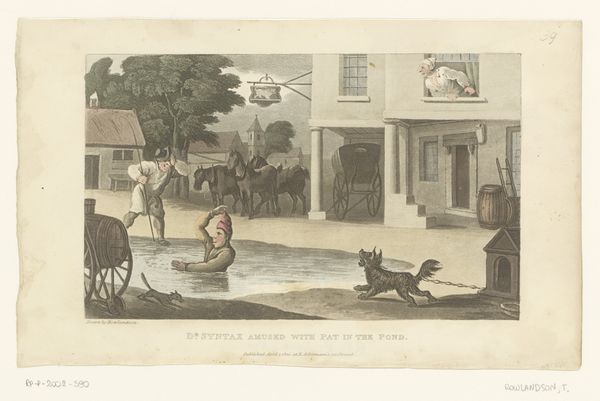 Curator: Take a look at this etching, likely dating from the 1880s, called "Binnenplaats van een hotel met paarden"—"Courtyard of a Hotel with Horses," made by C.R. Stock. Editor: It’s surprisingly calm, isn’t it? Even with all the activity. Sort of like a well-orchestrated ballet of commerce, horse maintenance, and waiting for travel. A brief pit stop that provides essential ingredients to our next adventure. I wonder if anyone is actually going to anyplace magical, or if this is how every day really feels when one can stop and wonder… Curator: You've grasped the central conceit. Structurally, the composition is arranged around a strong horizontal axis—the inn’s yard itself—bisected by the vertical lines of the figures, creating a balance between stillness and dynamic movement. The limited color palette and detailed rendering underscore the realism inherent in genre painting from this era. It has romantic and historic components that serve the viewer's eye and the overall harmony of the scene. Editor: Harmony...Yes, I feel a sense of muted celebration. It's as if the artist saw that everyday hustle for what it really is, which is us connecting. Think of it—the transfer from horse to coach; all are working at this. It is truly "moving forward together", each member playing their respective parts within life’s overarching narrative! The colors almost feel like faded photographs found in a drawer... So evocative! Curator: The etching technique allows Stock to capture incredibly fine details, particularly in the rendering of textures—from the cobblestones underfoot to the rich fabric of the coach and the glossy coats of the horses. One can feel how etching truly accentuates tonal shifts when the use of line is balanced with the application of aquatint—the medium's technical aspects beautifully complementing romantic subject matter like this piece before us! Editor: And the story the medium suggests; It shows how we must care for our horses. If that horse doesn't drink then nothing keeps moving! C.R. Stock paints a time when it's a bit more like "horses keep it moving” that contrasts now, where everything seems fast, all hustle with digital dust and chaos…What a charming commentary of commerce within these lines. A well-rendered window into our past. Curator: Indeed—an idyllic, somewhat romanticized view. We leave the viewer contemplating the echoes of time and the transient nature of human activity against the stoic backdrop of architectural permanence! Editor: Well, the best kind of "permanent" feeling is captured here, one of progress through community—isn’t that what we crave when stepping into another painting—ourselves among them?