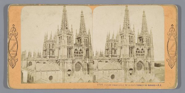 Editor: So this is "View of the Cathedral of Burgos" by Jean Andrieu, created sometime between 1862 and 1876. It’s a gelatin silver print photograph, and I find it surprisingly striking. The detail in the cathedral’s facade is amazing. What draws your eye when you look at this print? Curator: It's true, the photographic process allows such remarkable detail to be captured. What intrigues me most are the symbols embedded in this architectural rendering of the cathedral. Consider the spires reaching towards the heavens – they're not merely aesthetic. They represent aspiration, a tangible reaching for the divine. Does that resonate with you? Editor: Absolutely! It’s interesting how physical structures can represent something so abstract, like religious faith and our connection to the divine. Curator: And look at the symmetry in the composition. It echoes a desire for order, a visual harmony that resonates with a deeper sense of cosmic balance. But also remember this cathedral, like most, didn't appear spontaneously. What do you think of the layers of cultural memory within its architecture? What prior cultural beliefs did it draw on? Editor: Well, given that it's Gothic, it represents that particular era, the medieval world, Christendom’s height of power… but now I am curious, can we “read” religious or cultural values of the time through the images that are captured here? Curator: Indeed! Andrieu doesn’t just present the cathedral as stone and mortar; he presents it as an enduring symbol of spiritual and temporal power. These visual records hold profound weight when we begin to understand how places imprint collective ideas in the social and religious experience of human life. Editor: I see your point; this work captures both a place and a perspective rooted in deep symbolic value. Curator: Exactly! We should remember, places possess power. I think now, looking at the photograph, I recognize that our dialogue has provided a lens that can amplify our interpretation of it!