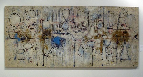 Bice Lazzari made L-11 with ink and tempera on paper, and you can really see the hand of the artist in every mark. It’s all about the process. Looking at the surface, there’s this amazing contrast between the delicate, almost scribbled lines and these bold shapes that feel so immediate. The way the red sits against the brown paper gives it a kind of rawness, like the colours are fighting to be seen. I can see small flecks of unmixed pigment, which show how Lazzari built up the image in layers. This layering creates the feeling of something ancient, like a strange, coded language, written down in an archive of personal expression. This makes me think of Cy Twombly, but with a more intimate, domestic feel. Lazzari invites us to imagine something incomplete, still in progress.