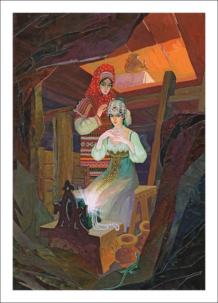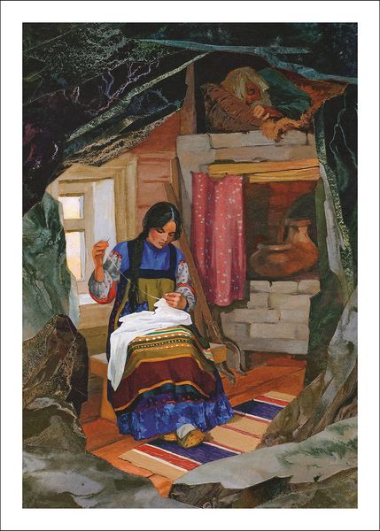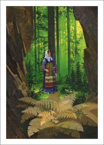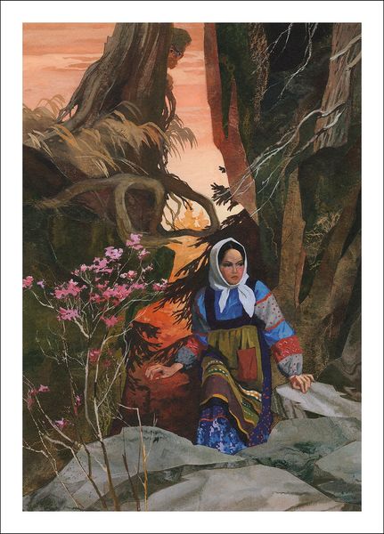 This illustration for The Ural Tales was created by Vyacheslav Nazaruk. The artwork depicts a young woman in traditional dress sitting in a forest clearing, and it seems to capture a moment of quiet reflection. The woman's attire offers a rich insight into the cultural identity of the Ural region, reflecting its history and folklore. The Ural region has a long history of mining, metallurgy and manufacturing. This has created a strong working class and has led to traditional folk tales about the area being filled with themes of labor, hardship, and resilience. Nazaruk's illustration likely draws upon this cultural context, offering a visual representation of the stories and traditions passed down through generations. To fully understand the artwork’s meaning, we can consult archives, historical records, and studies of Russian folklore. By examining the social and cultural context in which it was created, we can better appreciate its significance as a reflection of Russian identity.