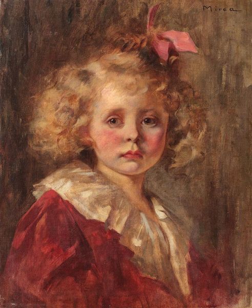 Curator: Pierre-Auguste Renoir's 1880 oil on canvas, titled "Georgette Charpentier Standing," is currently held in a private collection. Editor: Aw, she looks like she's stepped right out of a dream! All those pastel shades, soft edges... I feel like I could reach out and hug her, but she'd probably vanish like mist. Curator: Note how Renoir captures the essence of childhood through the skillful manipulation of light and color. The composition employs loose brushstrokes, characteristic of Impressionism. Consider, in particular, how the white of the canvas plays a crucial role in the painting's luminescence, serving not just as background but as an active formal element. Editor: Formal element? For me it is just pure Renoir! It is like that instant feeling that only children can provide - that fleeting, innocent beauty that painters are constantly trying to pin down with pigment. He really captured Georgette at a standstill in childhood. Curator: I see your point, certainly, although there's a calculated interplay between Realism and Impressionism in how Renoir uses broad strokes to suggest rather than define details, and then grounds them with a sense of tangible form through shadowing. The impasto technique adds an intriguing texture to her dress and hat. The whole figuration stands out gracefully on a seemingly simple composition. Editor: Mmm, her dress... all those little floral explosions dancing around that central bow! Reminds me of playing dress-up with my grandmother, all tulle and secret pockets filled with sweets. Don’t you feel like the redness of her stockings highlights her presence? She's poised between youthful energy and this posed formality. It's so affecting. Curator: Precisely. The vibrant hues, in strategic placement, ground the subject, giving her volume. And then, through these seemingly random strokes, it highlights Renoir's attention to color theory. He manages to evoke both fleeting beauty and the social positioning of his subject, Georgette. Editor: This whole image is a snapshot, or perhaps, a poem to ephemeral beauty—like capturing a sunbeam in your hands. Curator: Agreed. Renoir has achieved a rather unique synthesis here; a balance between the objective and the subjective, capturing an essence of fleeting reality.