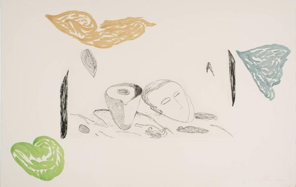 Editor: Here we have Aki Kuroda’s "Untitled," made in 2006 using ink drawing. It has a childlike whimsical quality, with figures floating in a light blue space. I’m intrigued by the variety of shapes and forms present. How do you interpret this work? Curator: What strikes me immediately is how this "childlike" quality challenges established artistic hierarchies. Kuroda, working in the 21st century, is engaging with a history of art that often valued technical skill and realistic representation above all else. But, here, the “naive” style could be interpreted as a deliberate rejection of those values. Consider the socio-political context of art institutions - galleries, museums. Editor: Interesting. So, the act of choosing this aesthetic could be seen as a commentary on the art world itself? Curator: Precisely. How do institutions traditionally present and legitimize art? Kuroda seems to be playing with our expectations. The "Untitled" nature further amplifies this ambiguity. There's also the figure that could be a jester— historically, jesters possessed a certain freedom to critique the court, but under the guise of entertainment. Editor: That adds a whole other layer to it. Almost like it's questioning authority, or at least, prescribed notions of what is considered ‘good’ art. Curator: Exactly! And perhaps even who gets to decide that. Consider also, ink as a medium. How does it relate to traditional practices of calligraphy and drawing within the broader cultural landscape? Editor: I hadn't thought about the medium in that light before. I guess I was too focused on the apparent simplicity. It’s like the work uses the freedom of artmaking to offer its own critiques. Curator: Indeed. And this dialogue between seemingly disparate elements - figuration, abstraction, deliberate “naivety”—ultimately provokes us to reconsider the power dynamics inherent in artistic creation and reception. Editor: This has made me appreciate how artworks, even seemingly simple ones, engage with really complex power structures! Thanks!