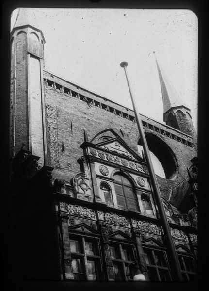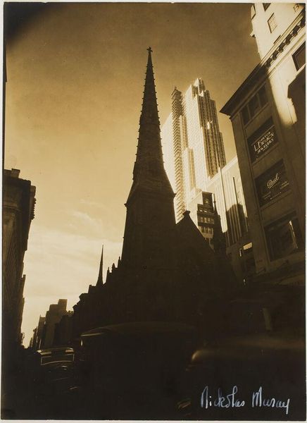 Curator: This photograph, attributed to Laurence Feininger, is titled "Church in Lübeck." Editor: The upward perspective gives me a feeling of insignificance against the backdrop of those towering gothic spires. Curator: Consider how the church, a symbol of faith and community, physically dominates the surrounding architecture, shaping the city's identity. Editor: It's a somber image, isn't it? The high contrast and sharp angles seem to emphasize a sense of imposing authority. Curator: Indeed, gothic architecture often sought to evoke awe and reverence, reinforcing the Church’s power through visual grandeur. Editor: I see that, and I also appreciate how the artist's careful capture allows us to reflect on the historical role of religious institutions. Curator: Absolutely, and it’s a reminder of the enduring influence of sacred spaces on our collective consciousness.