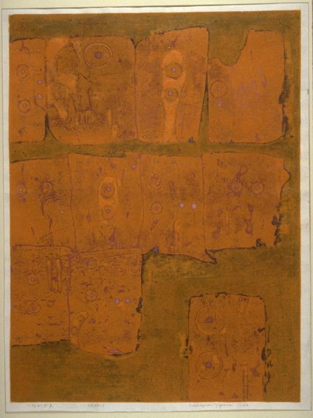 Curator: Standing before us is "Ocre," an oil painting created by Roger Bissière in 1954. It's a compelling example of abstract expressionism from that period. Editor: It hits me as incredibly earthy. The browns, ochres, greens—they're all so muted and grounded, but there's also an underlying structure, a grid trying to hold it together. Curator: Yes, Bissière's work often explores that tension between structure and spontaneity. He came to abstraction relatively late, around the age of sixty, after having absorbed cubist influences and figurative styles. The grid is reminiscent of Mondrian, although less rigid and more lyrical. Bissière initially worked within the style of Post-Impressionism after becoming familiar with Cezanne’s paintings. Editor: The grid becomes a carrier of other shapes and colors, each cell holding a potential symbol. Do you see some organic forms nestled within? Are those evocative figures trapped behind the squares? I wonder about how World War II might be influencing the feelings within this painting, with those harsh black strokes representing a kind of trauma. Curator: That's an insightful perspective. The post-war era undoubtedly shaped artists' sensibilities. There was this overall push toward experimentation and the individual, as reflected in the abstract expressionist movement and its development throughout galleries across the U.S. This movement really focused on spontaneous, emotional gestures, although with Bissière we do see a lingering focus on more controlled shapes. Bissière would exhibit throughout Europe as well as at institutions in New York like the Brooklyn Museum and the Carnegie Institute. Editor: To me, this doesn't feel like unbridled expression so much as a carefully constructed meditation on the color, ocre. Each shade and geometric nuance calls forth its own symbol or idea. It's beautiful but somehow melancholy, maybe that comes from the grounding tones or the knowledge that its artistic movements were created after much of the Western world fell into ruin. Curator: Bissière carved a distinct place for himself within the abstract landscape, blending a controlled yet expressive quality and the impact of societal pressures with careful attention to the physical materiality of his chosen colors. Editor: For me, “Ocre” acts as a sort of container, where our feelings can become free and mix.