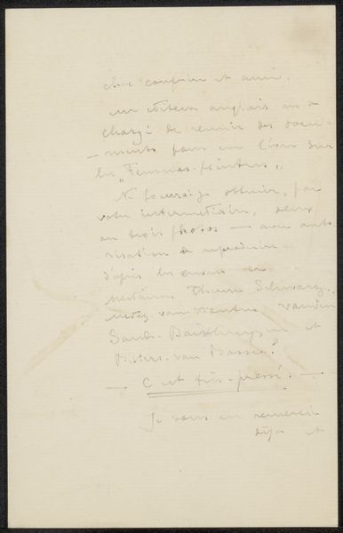 Curator: Welcome. Here at the Rijksmuseum, we have before us a piece titled "Conceptbrief aan anoniem," a work on paper from 1911 by August Allebé, executed in ink. Editor: It's striking. The density of text creates such an immediate impression of formality mixed with a personal plea. Look at the elegant flow, almost rhythmic in its execution. Curator: Indeed. As a drawing it challenges the conventions of typical gallery works, becoming an intimate object by focusing on skill. Here we have direct insight into pedagogical labor at the academy. Consider the time investment for student feedback. Editor: Exactly. We’re meant to focus on the curves, the serifs, the individual marks that form a coherent textual composition, yet it's content dictates it is about institutional instruction of a single woman, likely from a wealthy background. It appears formal in design. Curator: The script reveals the structures of the academy. Think about the availability of drawing materials in the Netherlands at the beginning of the twentieth century. Even the grade of paper stock reflects institutional practices that dictated professional training. Editor: However, Allebé's use of ink brings such tonal variety and textures to this writing—a kind of calligraphic symphony almost despite itself, while it’s mere a memo with a clear practical purpose. This isn't intended to be pretty. Curator: True, it fulfills an administrative need, yet it’s hard not to notice how closely connected craft is here. What, exactly, is elevated and diminished through material choices remains fascinating to observe, I think. Editor: Yes, and I’m glad that the placement and weight allow you to have many points of entry in one frame. Seeing all of that combined offers something truly complex. Curator: A blend of intention and labor yields unexpected effects when re-framed as fine art. Thank you for those points.