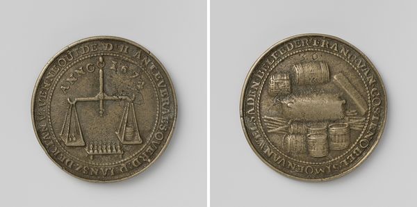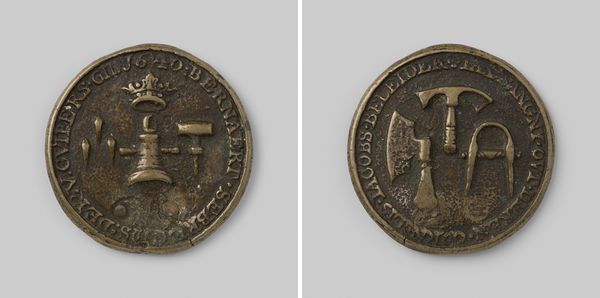 Curator: This bronze relief is titled "Presentiepenning van het Zijdelakerkopers- en Kramersgilde te Middelburg, 1689." The medal's details portraying aspects of the silk and linen trade are remarkable. What grabs your attention? Editor: I notice how much information they've packed into such a small space! It seems to depict daily life and work, and the different tools. What do you make of the use of bronze? Curator: The choice of bronze is crucial, linking directly to materiality and economic function. Bronze, more durable than other metals, signals permanence and value, fitting for a guild token meant to signify membership and legitimacy within the marketplace. Do you see how the choice of material reflects the guild's standing within Middelburg's economy? Editor: I think so. It’s not just decorative, but a statement about their business and its importance. It’s like they’re embedding the values of their profession right into the material. How did guilds typically operate at this time? Curator: The Guild system involved strict control over the production, sale, and quality of goods. Note how this relief likely was produced serially. We should examine if the mass production of the bronze piece contrasts with the notion of "high art" from the same period. Consider whether the item reflects and perpetuates social hierarchies. Can you tell from the object? Editor: Now that you mention it, I wonder how the artisans who crafted these tokens were valued within the guild's social structure? Perhaps they were less celebrated compared to other trades. Curator: Exactly. Their labor in producing this marker is essential but somewhat invisible, contributing to the guild's overall prestige. I am most struck by its significance to consumption during its use, with workers manufacturing for other businesses that likely profited far more from trade. It almost serves as a reminder of how materials like linen and bronze had profound, embedded stories. Editor: I hadn't thought about the medal as being a story itself! The way the material itself signifies value adds another layer. Curator: Yes, this guild token becomes not just art but also a lens to understand economic structures and labor. It definitely provides new perspectives. Editor: Absolutely! Now, looking at it again, it seems that its materiality is not merely medium, but truly the message. Thanks so much for the insight!