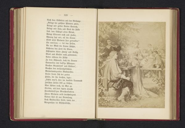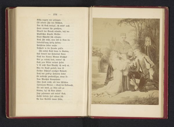Curator: What immediately strikes me is the overwhelming melancholy in this photographic reproduction. There’s something so beautifully fragile in the way the figures are rendered. Editor: Yes, Konrad Brandel created this before 1876, and we’re looking at a “Fotoreproductie van een schilderij voorstellende een ridder en een vrouw op een bospad,” which translates to “Photographic reproduction of a painting depicting a knight and a woman on a forest path." I’m curious about the original painting—what were the artistic traditions around reproduction in Poland, at that time? Was photography primarily a tool for dissemination of artworks? Curator: I imagine it certainly played a part. Think about the Romanticism permeating the scene. It's not just documentation; Brandel's manipulated the light and composition, lending it a sense of theatrical staging—the textures and tonality evoke an idealized past. Did the availability of reproduced images shape the artistic tastes and visual literacy of a growing audience? Editor: Undoubtedly. Prints, in particular, democratized images, moving artwork from elite collections into wider circulation and fostering a culture of artistic engagement beyond the traditional art world. Also, looking at the tonal contrasts created in the printmaking process here, I think it also adds another layer: The act of reproducing adds, and I want to see what's gained here besides accessibility. How does it interact with craft and artistry, considering that romanticism here idealizes some very traditional notions? Curator: Maybe that longing for an idyllic past resonates so profoundly *because* of its accessibility, wouldn't you think? Here is this incredibly polished image. Editor: That tension—between production and consumption, high art and accessible media—it reshapes both. So the means *are* very interesting. A study of access also illuminates the ways it's shaped not only the production, but, importantly, the interpretation, which helps build its enduring cultural legacy. Curator: That makes me reflect on how easily an image can be shared today, with all sorts of tools and methods. It's hard not to look for a narrative here! But thinking about what kind of emotional story this object wants to express. Editor: Ultimately, looking closely reveals these old artworks are less frozen than they first appear; their contexts shift depending on access.