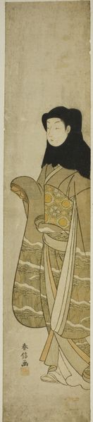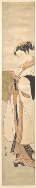 Curator: Look at how serenely she regards the small cat at her feet. I find Suzuki Harunobu's “Girl Playing with a Cat,” a woodblock print from around 1769 or 1770, so incredibly peaceful. Editor: It’s that narrow, vertical format combined with muted palette, right? A study in recessive tones that emphasizes the surface of the print itself. What else strikes you? Curator: Harunobu excels at portraying domestic intimacy. The girl, likely a young woman of leisure, teases the cat with a string. The cat, seemingly suspended mid-leap, gives the impression of shared delight. Beyond that, I read in the piece elements of cultural memory, for example, of aristocratic women portrayed with cats to denote luck and luxury. Editor: I agree. Formally speaking, the curve of the woman’s body and the cat’s arching back echoes the curves of the round fan motifs decorating her kimono. And the strong diagonal pull of the string anchored in the upper left visually leads the viewer’s eye down to the focused interaction with the playful cat. I also notice a few scattered motifs of stylized leaves and what seem to be blossoms throughout, drawing together that pictorial plane. Curator: These details speak to Harunobu's ingenuity within ukiyo-e printmaking, depicting daily life with extraordinary attention to nuance and subtlety. In Japanese folklore, cats are also associated with warding off evil spirits and, of course, bringing good fortune. Her act of playing embodies a lightness of spirit. The print offers a tender observation of fleeting joy. Editor: Perhaps! It certainly strikes a lovely, contained mood. Though, given its composition, and the artist's careful control over visual cadence, I still feel there's more attention being paid to the pictorial language rather than the depicted action. Curator: Perhaps that is where our reading differs, after all! Editor: It seems so. It's always rewarding to realize there are such divergent points of engagement.