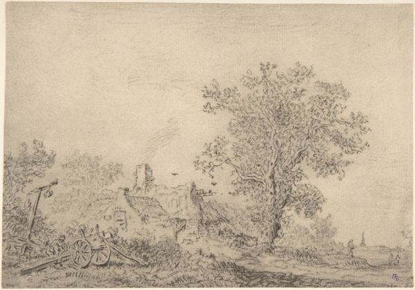Editor: So, here we have "Landscape with the Petronella Chapel in De Bilt," created between 1638 and 1644 by Jan van Goyen. It's a delicate pencil drawing housed at the SMK in Copenhagen. It has such a serene, almost melancholic feel. What do you see when you look at this work? Curator: For me, it whispers stories of 17th-century Dutch life. It's a snapshot of a seemingly ordinary day, yet imbued with this palpable sense of quiet contemplation. You almost feel the gentle breeze rippling through the scene, hear the distant clatter of the wagon wheels, don't you think? What grabs your eye first? Editor: Definitely the ruins and those figures sitting there – they're just...existing. It gives me a sense of the everyday wearing away the monumental. Curator: Exactly! Van Goyen wasn’t interested in grand pronouncements but rather in the quiet beauty of the Dutch landscape and the unvarnished lives lived within it. He was capturing light and atmosphere and making us ponder. Do you notice the hazy sky almost dominating the scene? It flattens the perspective while imbuing the drawing with light. Editor: It almost feels unfinished in a way. Curator: Perhaps intentionally so. Van Goyen was incredibly prolific, sometimes producing drawings in mere hours. Think of it as a visual poem, capturing a fleeting moment. It's about capturing the essence, that fragile, transient moment in time. A moment that then stretches to fill our own time, now. Editor: That’s a wonderful way to look at it. I was so focused on the tangible objects. I've now learned to really appreciate van Goyen's vision for capturing mood and the ephemeral. Curator: Precisely. It reminds us that true beauty can often be found in the most understated corners of life, don’t you think? It all just lingers.