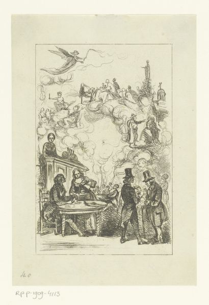 Curator: The print before us is titled "Garrick Speaking the Jubilee Ode," made in 1784 by Caroline Watson after a design by B.T. Pouncy. It commemorates David Garrick's performance at the Shakespeare Jubilee in 1769. What’s your first reaction? Editor: Well, it’s certainly dramatic! The swirling smoke, the theatrical figures, it’s all very staged. Almost like a fever dream fueled by powdered wigs. The texture achieved in this engraving—amazing range. You can almost feel the texture of the drapery and stone. Curator: Exactly! The print served a vital role in disseminating imagery of the Jubilee, ensuring its cultural and political influence reverberated long after the event itself. Think of the implications around national identity, as theatre and public life were rapidly expanding and democratizing. Editor: I’m struck by the composition itself. We have the performer, the Shakespeare statue on a decorated pedestal and the theatrical smoke. Watson is using distinctly reproducible means to memorialize this event. Do you think the relatively inexpensive nature of a print broadens the cultural impact here? Curator: Undoubtedly. Consider the politics of accessibility. Caroline Watson’s reproductive engraving created an expanded public for the Jubilee, far beyond those who could attend. The image circulates and creates further opportunities for cultural understanding and even potentially political engagement, beyond its local moment. Editor: And Watson, as a woman engraver, had a vital but frequently unacknowledged place in the making of British visual culture. The engraving becomes both an artifact and evidence of underrecognized labour. How do you think this fits into Watson's own career as a printmaker? Curator: Watson's meticulous craft clearly promoted her career; her ability to capture complex subjects, like the dynamism of Garrick and the textures of the theatrical set, would cement her reputation and create professional opportunities, while continuing to grow her patron base and artistic networks. Editor: Looking at it from that lens, it moves beyond a commemoration to one artist celebrating another—it’s also evidence of craftsmanship, industry, and a vibrant performance. So much conveyed through reproducible lines. Curator: I agree. It's a fascinating artifact and study in how social history and material production intertwine. Editor: It provides food for thought on what’s left behind from public performances and reveals labor through materiality.