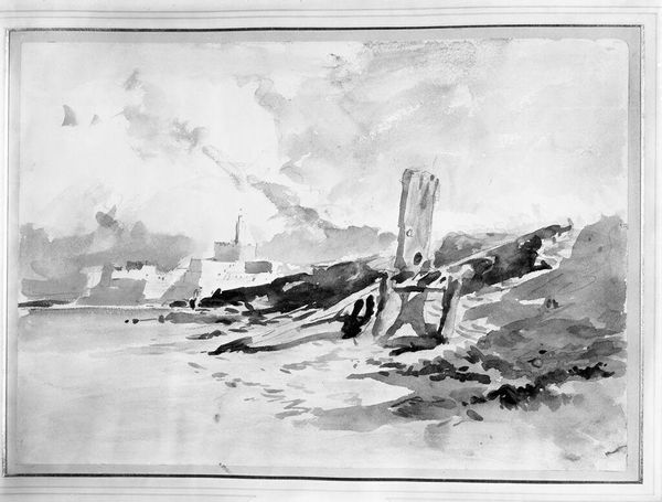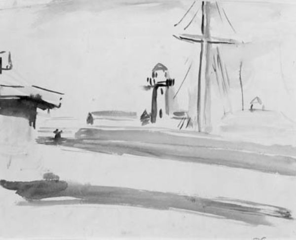 Curator: At first glance, this image evokes a sense of stark isolation, wouldn't you agree? The grey scale is somewhat unsettling. Editor: Indeed. We're looking at "Villa near the Mountain," a charcoal and pencil drawing by Carl Kylberg, likely created between 1906 and 1910. It's part of the collection here at the SMK, the Statens Museum for Kunst. Curator: Kylberg really exploits the inherent qualities of charcoal, doesn't he? The varied pressure creates this almost spectral depth. The foreground is a masterclass in atmospheric perspective, with those faint lily pad shapes barely discernible. Editor: It’s interesting to consider the social context, here. Kylberg lived through immense social change in Sweden. This quiet scene stands in stark contrast to that turbulent world, offering a glimpse into an almost private, introspective space. One wonders about the villa and the implied inhabitants…were they escaping the social upheavals themselves? Curator: Perhaps, but I'm more drawn to the deliberate sketchiness of it all. It's less about representing a literal place and more about the raw feeling of a place. The negative space around the house itself… the way the artist allows the light to come through by way of reduction of detail... is it almost a premonition of abstraction? Editor: It might very well be. Also consider how art institutions shape meaning. The museum elevates such a drawing to the level of ‘art,’ prompting us to analyze it differently than if we just stumbled across it as a discarded sketch. The viewer’s role is forever altered, and a mundane vista attains monumental status by the sheer curatorial selection of the piece. Curator: True. Regardless, there's a fundamental elegance to the simplicity Kylberg achieves. The relationship between shadow and line – that's the true narrative here. The values are restrained, allowing the formal essence to emerge with striking power. Editor: Agreed. And thinking of our current socio-political climate, this almost forgotten villa perhaps reminds us of the solace that one may still find in nature. Curator: I appreciate how reflecting on formal qualities brought us here. It highlights the enduring power of design choices to convey atmosphere and ultimately generate narrative in unique and personal ways. Editor: Yes, and I leave having considered how institutions shape our interpretations, inviting critical thought about the relationship between society, the artist, and their creations.