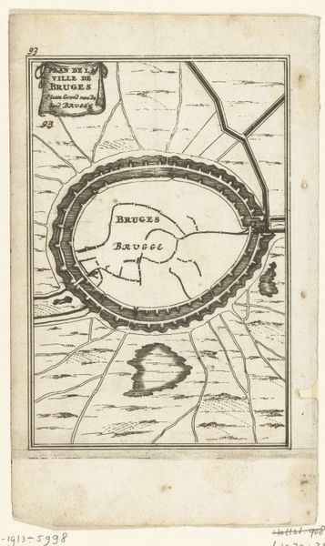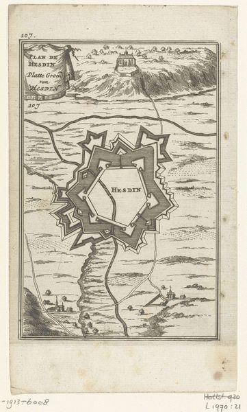 Editor: Here we have "Illustratie voor 'Den Arbeid van Mars' van Allain Manesson Mallet" created in 1672 by Romeyn de Hooghe, it is currently at the Rijksmuseum, and it's an engraving. The lines are incredible, but what do you make of it? Curator: Indeed. The engraving exhibits a striking formal arrangement. Consider the geometrical precision, the interplay between line and negative space. It’s a dialectic—an oscillation between depiction and abstraction. How do these formal qualities contribute to the overall aesthetic impact? Editor: The geometric shape, the walled city of 'Dvnqverqve' against what seems like water...it's like geometry meets nature. Is there a contrast at play? Curator: Precisely! The contrasting textures - the angular city plan against the fluid representation of water - activate a visual tension. We should observe the distribution of tonal values and how they articulate the overall composition. What principles might the artist be attempting to resolve? Editor: Perhaps to present an idealized form of control over nature through a city plan? And the texture… Is that an illusion, or is that simply due to the medium used, engraving? Curator: Ah, the very materiality asserts itself. The physical act of carving those lines dictates, in part, the final form, yet the artistry lies in leveraging these material constraints to produce compelling visual language. The crosshatching creating tonality… Editor: That’s interesting. It's like the medium dictates the message. The city looks solid and yet it is presented through delicate lines. Curator: Yes, consider how the line becomes both structure and decoration here. De Hooghe’s mastery of the line transcends mere representation. It evokes depth, texture and form through its systematic application, no? We come to learn more about formal order from that initial graphic plan. Editor: It is like he elevated city planning into fine art using geometry and lines. Curator: An astute observation. In doing so, he unveils underlying structures, making visible the very mechanisms of visual representation and revealing structure as subject. We’ve observed here how, in this paradigm, the material processes inform content itself.