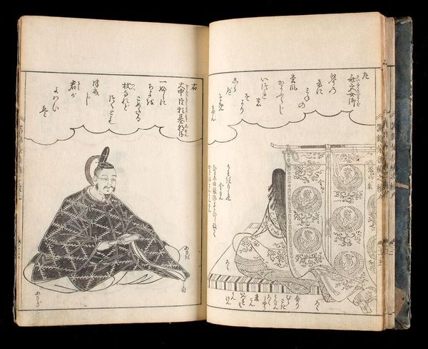 Curator: This woodblock print, "Famous Historical Warriors in Action," is from Volume 1 of "Ehon Muchi Bukuro" by Torii Kiyonaga. Editor: I find this image so compelling, it’s aged but still powerful. The warriors seem poised between action and contemplation. Curator: Kiyonaga, active in the late 18th century, was known for his idealized depictions of women, but also produced warrior prints, which allowed for an exploration of social ideals around masculinity and duty. Editor: And we see that conflict here. One figure appears burdened and aged, while the other is youthful and ready for battle, really highlighting the personal cost of these kinds of conflicts. Curator: Absolutely, and these prints were often consumed within a broader cultural context of rising merchant class, which in turn reshaped the perception of samurai values. Editor: It's a fascinating lens through which to examine not just historical events, but also the societal shifts impacting the perception and idealization of warrior culture. Curator: A reminder of art's role in shaping and reflecting historical values. Editor: It does give one pause to reconsider the romanticization of historical narratives.