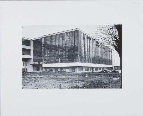 Curator: This photograph, from the Photothek archive, captures the Bauhaus Building in Dessau around 1925-26 during its construction. Editor: It feels so austere. The stark white walls and rigid geometry give it a feeling of almost utopian severity. Curator: Indeed. The Bauhaus was founded on the principle of uniting art, craft, and technology. This building became a physical manifesto of their core beliefs, influencing countless architectural designs. Editor: Looking closer, the bridge connecting the two wings is a powerful symbol. It speaks to the Bauhaus ideal of interconnectedness and collaboration. Curator: Absolutely, and the large glass windows suggest transparency. The building, even incomplete, broadcasts its intention to revolutionize design. Editor: It's a fascinating visual statement, a symbol of the Bauhaus movement's enduring impact. Curator: A testament to their vision.